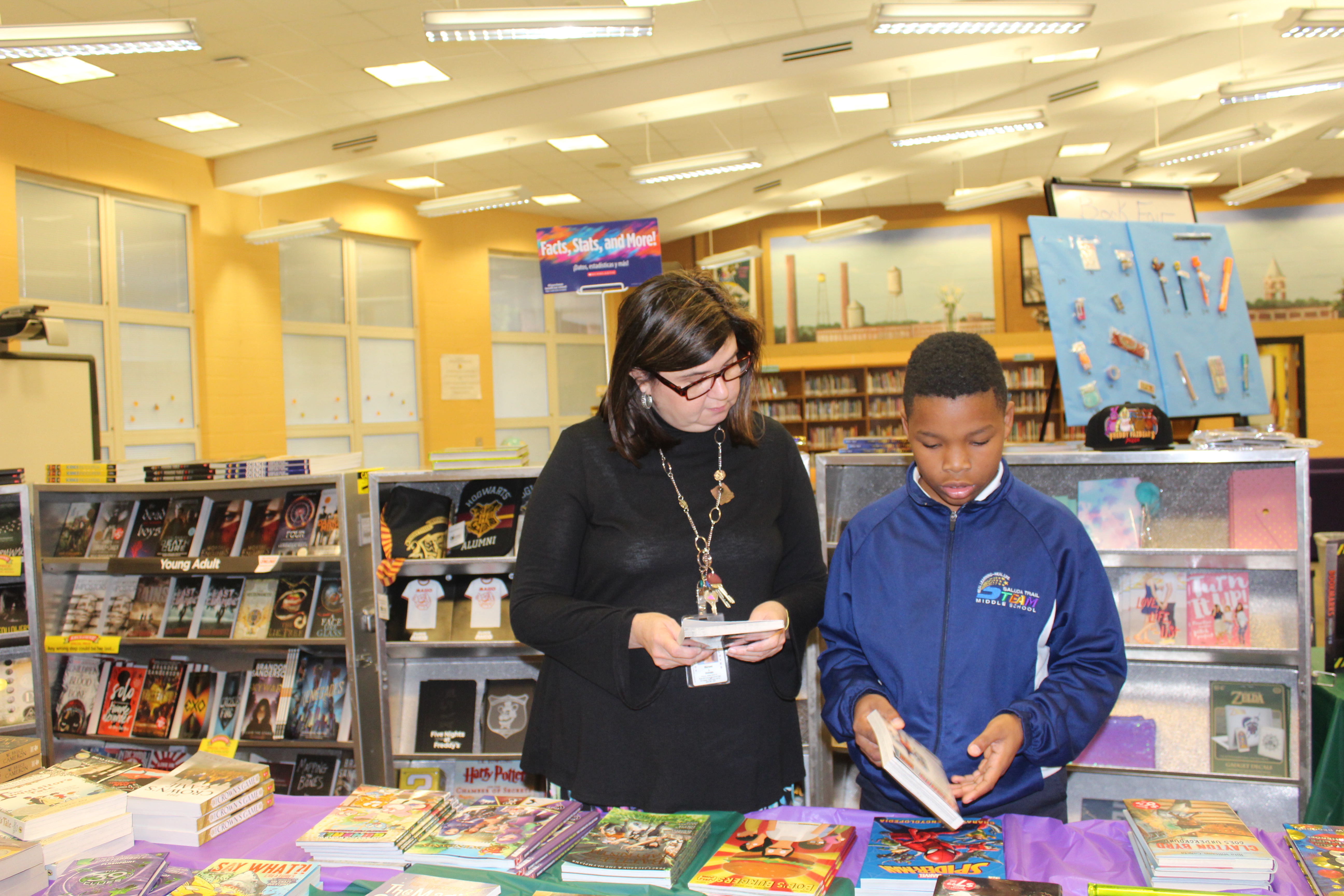 Ms. Inman, Saluda Trail’s Media Specialist, helps Dalvin Rawlinson, a 6th grader, looks for books at the annual Fall Book Fair.
